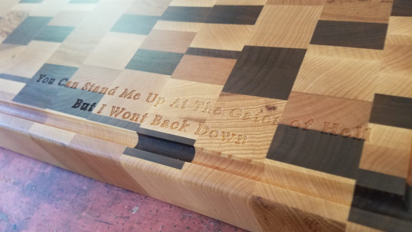 Buying a Butcher Block? Or a Points Cover? Add a custom engraving to your new purchase. The format is approximately 2-3 inches in diameter, and the design is best suited to logos, short phrases, or signatures and names. The engraving is made with an acute V-carve bit at a depth that best suits the product or the carving. Click on the ‘Add To Cart’ button and then write the description of what you’re looking for in the comments section. If you have a Logo or Signature you want copied, you’ll need to attach it to an email. Please allow 3-5 extra days for processing.
